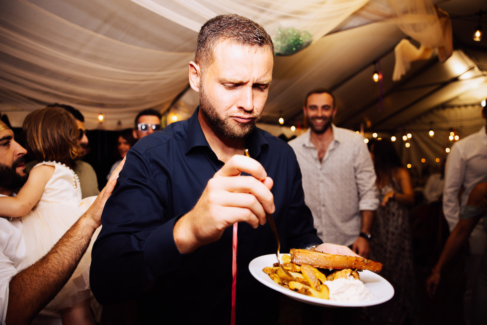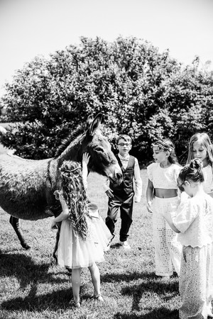 Pendant ce temps, l'âne finit son repas et un témoin me glisse qu'une énorme boutade est prévue pour l’entrée de la cérémonie. Quentin ayant la larme facile, ils ont prévu de lui amener une fausse mariée avant l'arrivée de Laurine.